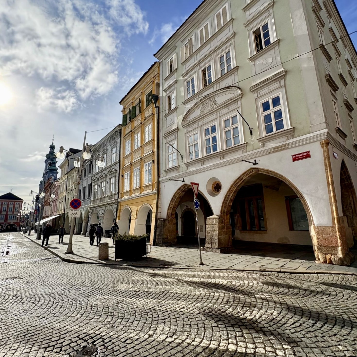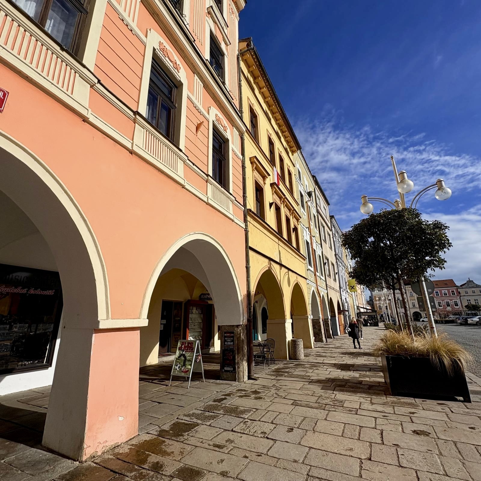 České Budějovice est à 1h30 de Prague, dans une région rurale de la Bohême du Sud, proche de la frontière autrichienne. C’est une ville dont l’histoire s’est construite par des croisements de populations allemandes (d’où son autre nom Budweis), autrichiennes, juives et quelques autres. Une ville dont la notoriété internationale est aussi liée à la bière – la Budweiser. Ici, le centre ville historique est très beau, une place centrale avec des bâtiments aux façades pastels, il y a un peu d’Italie dans les galeries couvertes des rues avoisinantes.