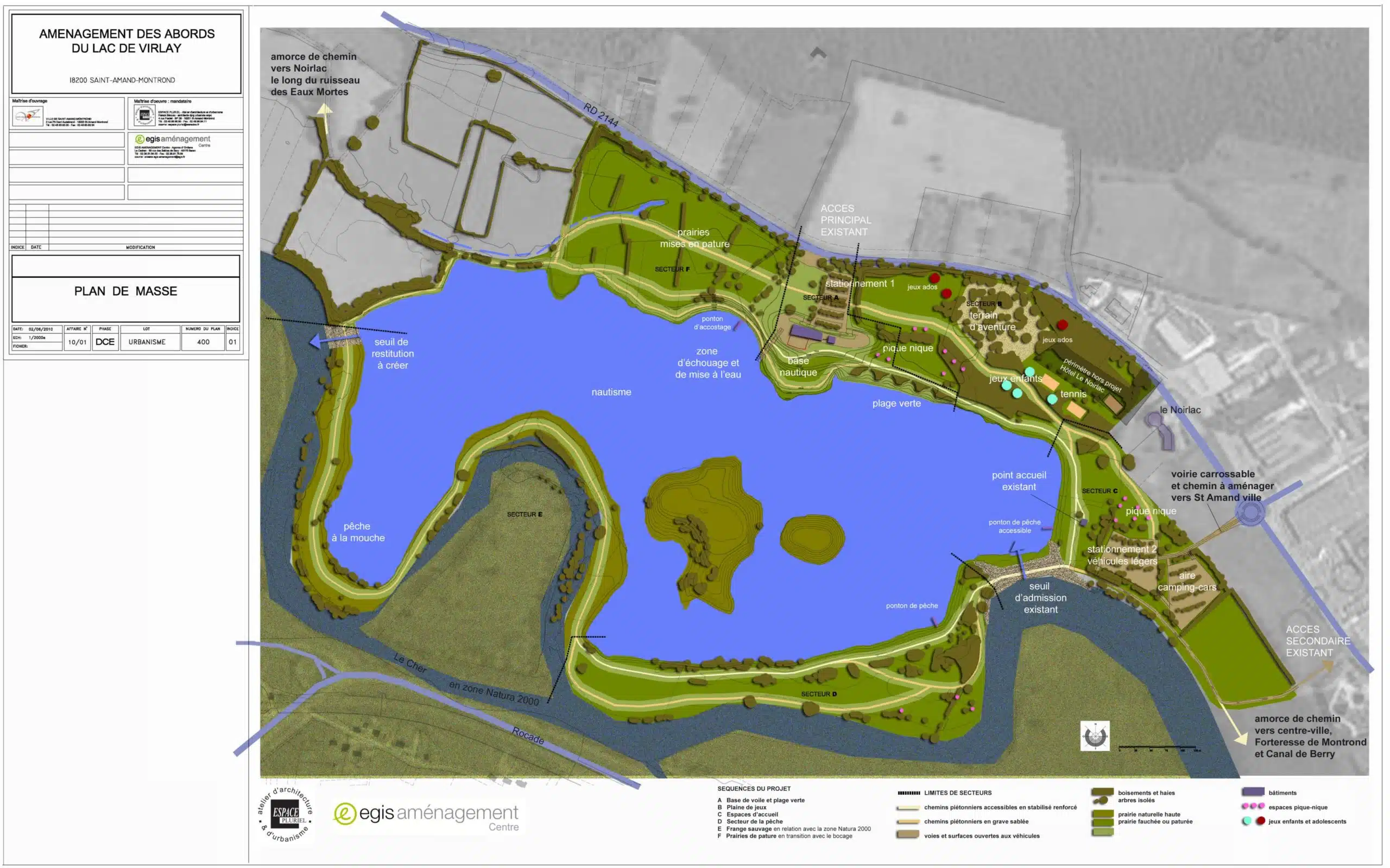 Illustration et accord de l’auteur pour diffuser le plan : Plan d’architecte intitulé « Aménagement des abords du lac de Virlay », plan de masse, n°400, le 02 juin 2010. Le plan a été produit par le maître d’œuvre de l’aménagement du site et auteur du plan, l’atelier d’architecture Espace Pluriel, Franck BECUAU architecte DPLG, urbaniste ENPC et le BET EGIS Aménagement.