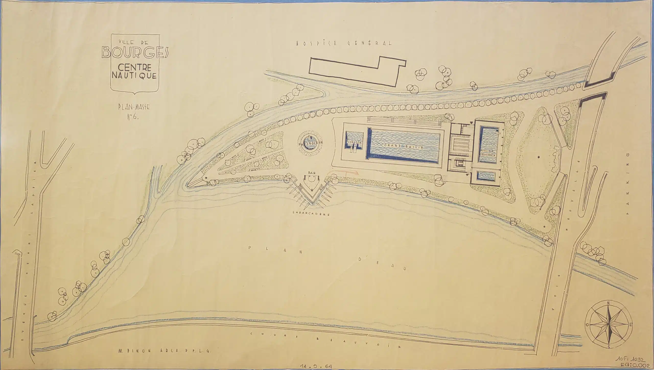 Plan de masse des bassins de natation du centre nautique des Prés-Fichaux entre l’avenue Henri Laudier et l’avenue du Onze Novembre 1918. Dessin à l’encre, échelle 1/200. La construction du centre nautique des Prés-Fichaux est un projet visant à remettre la natation au cœur des pratiques sportives Berruyères. Pour qu’il soit facilement accessible par les habitants, il est construit en centre-ville, au croisement de l’Yèvre et de la Voiselle, à proximité du jardin des Prés-Fichaux qui lui donne son nom.